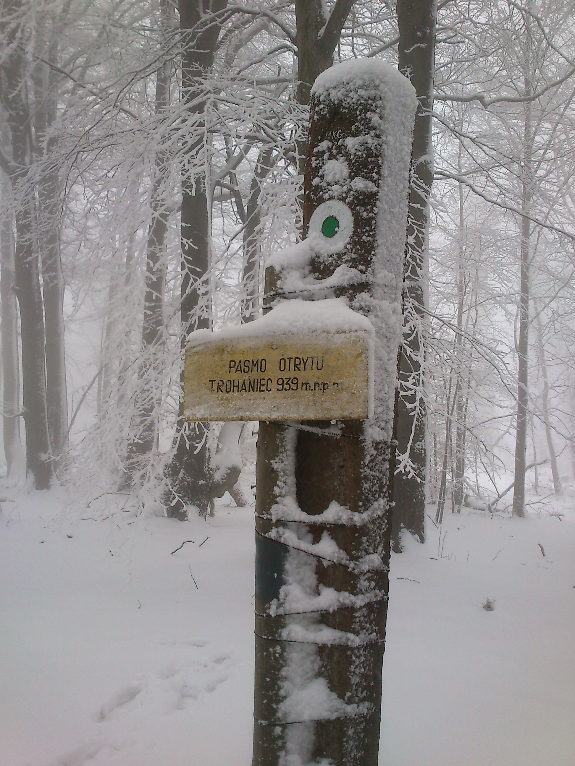 Jak na włóczykijów przystało powłóczyliśmy się co nieco po okolicy z różną intensywnością i zapałem. W sobotę w towarzystwie lekko kapryśnej pogody (jakkolwiek nie lało) różnymi drogami dotarliśmy do Chatki Socjologa na Otrycie, gdzie aura była zdecydowanie zimowa, mimo iż początek trasy czy z Dwernika (niebieskim szlakiem) czy też z Chmiela (żółtym szlakiem konnym) wiązał się raczej ze ślizgiem po błocie niż spokojną wędrówką obranymi przez nas drogami. Z Chatki Socjologa rzut kamieniem na Trohaniec (939m) więc grzechem byłoby tam się nie udać.