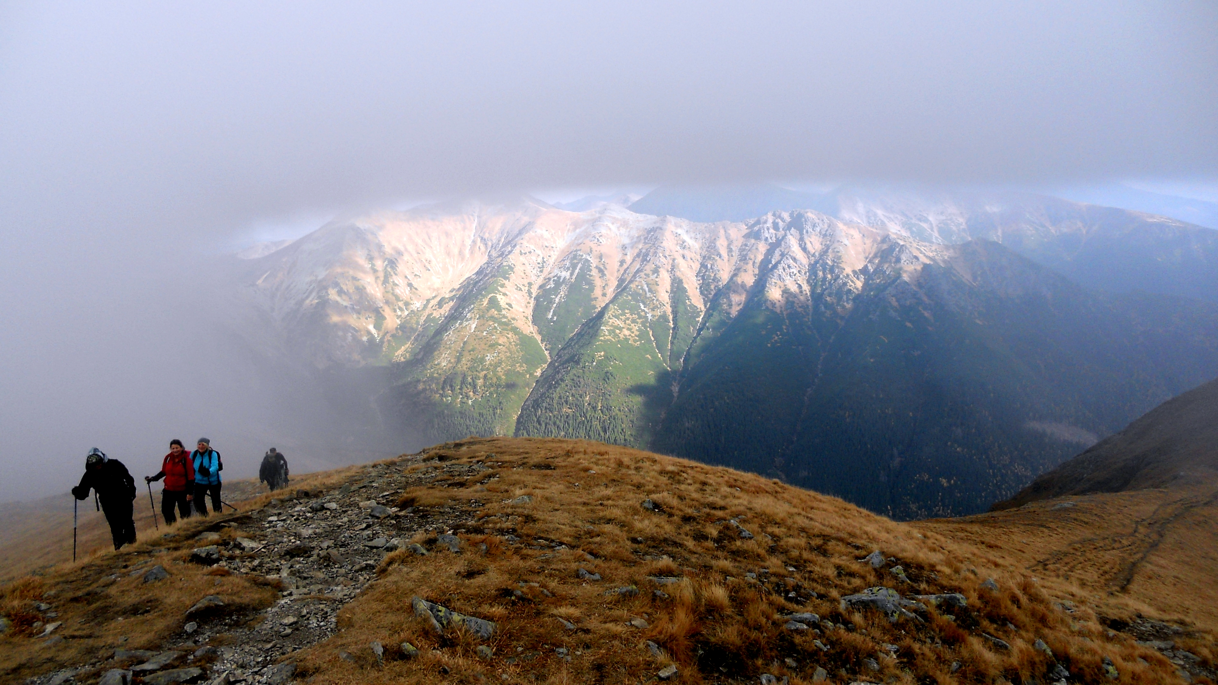 Dzięki rezerwacji noclegów w Żiarskiej chacie mogliśmy podjechać samochodami na parking przy chacie. Po umieszczeniu plecaków w pokojach i przygotowaniu na wędrówke około godziny 10 bardzo liczna, bo licząca 35 osób grupa wyruszyła na szlak. Na Smutnym sedle grupa podzieliła się. Część ludzi (zwyciężyła akrofobia ???) udała się na Plaćlivy Rohać a część (20 osób) podążyła zgodnie z planem, czyli na Tri Kopy, Hrubą Kopę i Banikov.