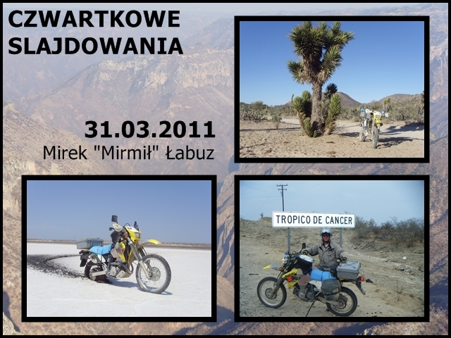 Już w najbliższy czwartek tj. 31 marca 2011 roku zapraszamy po raz kolejny wszystkich klubowiczów i sympatyków oraz wszelakiego rodzaju podróżników na CZWARTKOWE SLAJDOWANIA, tym razem zdjęcia i opowieści przedstawi nam Mirek "Mirmił" Łabuz z wyjazdu do Meksyku, czyli "Baja Mexiko - meksyk, półwysep baja i cooper canyon z wysokosci siodełka motocyklowego", Start godzina 20.00, PUB LATARNIA.